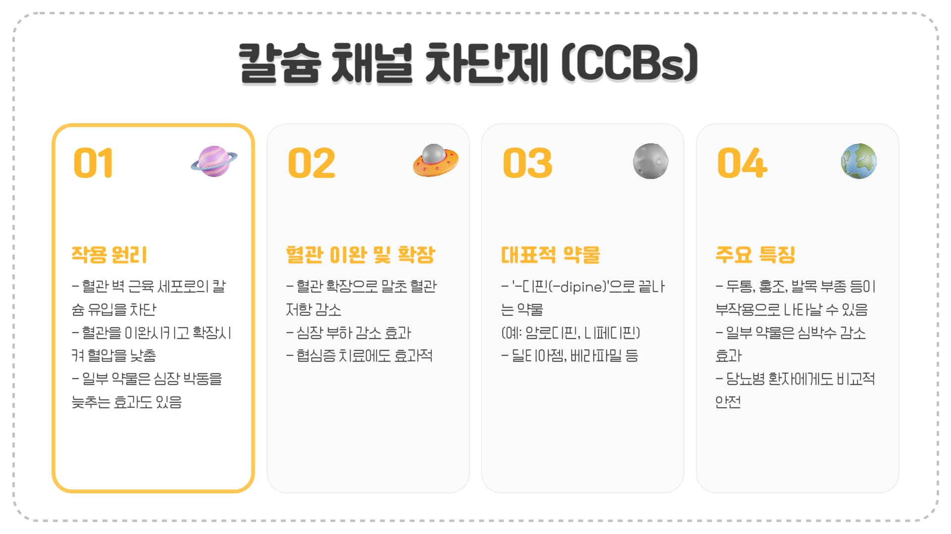 혈관 벽 근육 세포로 칼슘이 유입되는 것을 차단하여 혈관을 이완시키고 확장시켜 혈압을 낮춥니다. 심장 박동을 늦추는 효과도 일부 있습니다. | 주로 '-디핀(-dipine)'으로 끝나는 약물 (예: 암로디핀, 니페디핀 등), 딜티아젬, 베라파밀 등 |