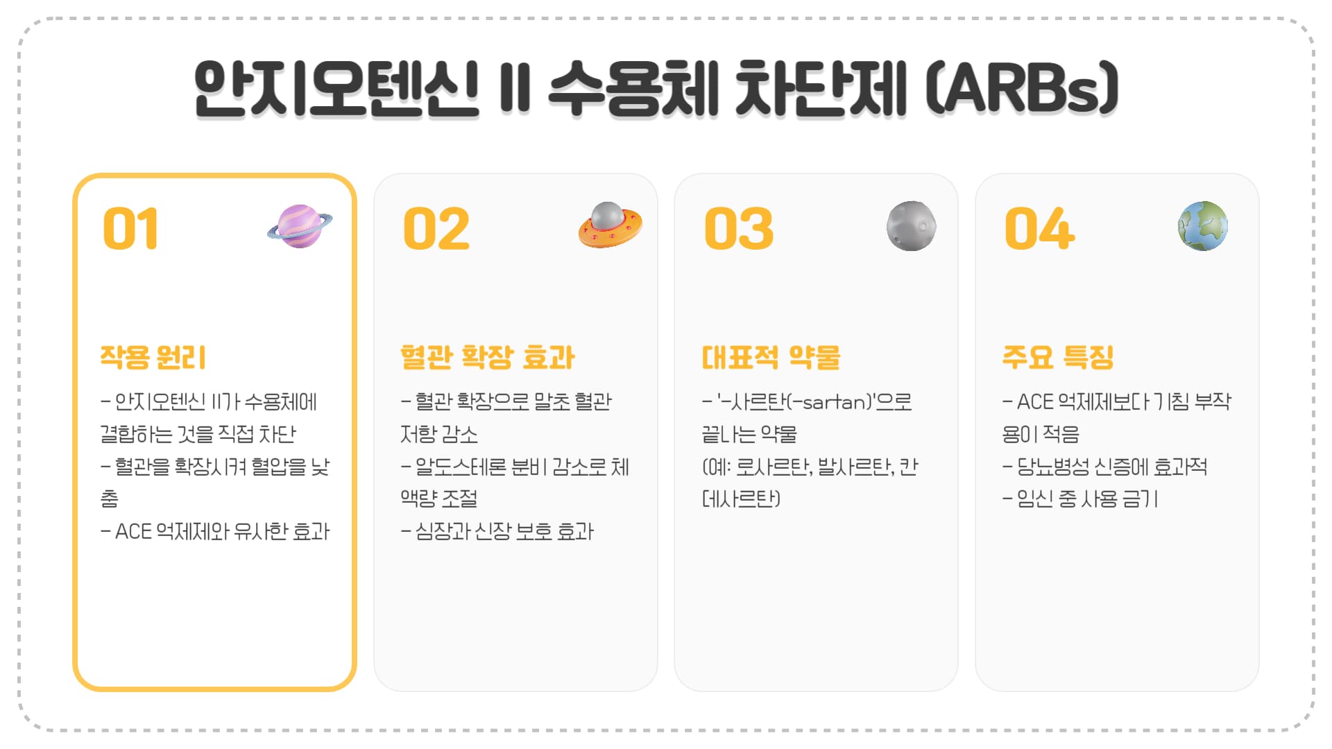 혈관 수축 물질인 '안지오텐신 II'가 혈관의 특정 수용체에 결합하는 것을 직접적으로 차단하여 혈관을 확장시키고 혈압을 낮춥니다. ACE 억제제와 유사한 효과를 나타냅니다. | 주로 '-사르탄(-sartan)'으로 끝나는 약물 (예: 로사르탄, 발사르탄, 칸데사르탄 등) |