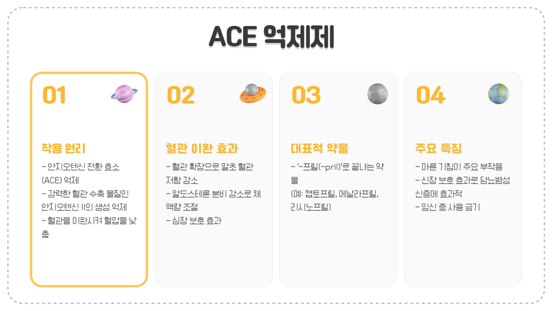 혈관을 수축시키는 강력한 물질인 '안지오텐신 II'의 생성을 억제하여 혈관을 이완시키고 혈압을 낮춥니다. 알도스테론 분비도 감소시켜 체액량 조절에도 관여합니다. | 주로 '-프릴(-pril)'로 끝나는 약물 (예: 캡토프릴, 에날라프릴, 리시노프릴 등) |