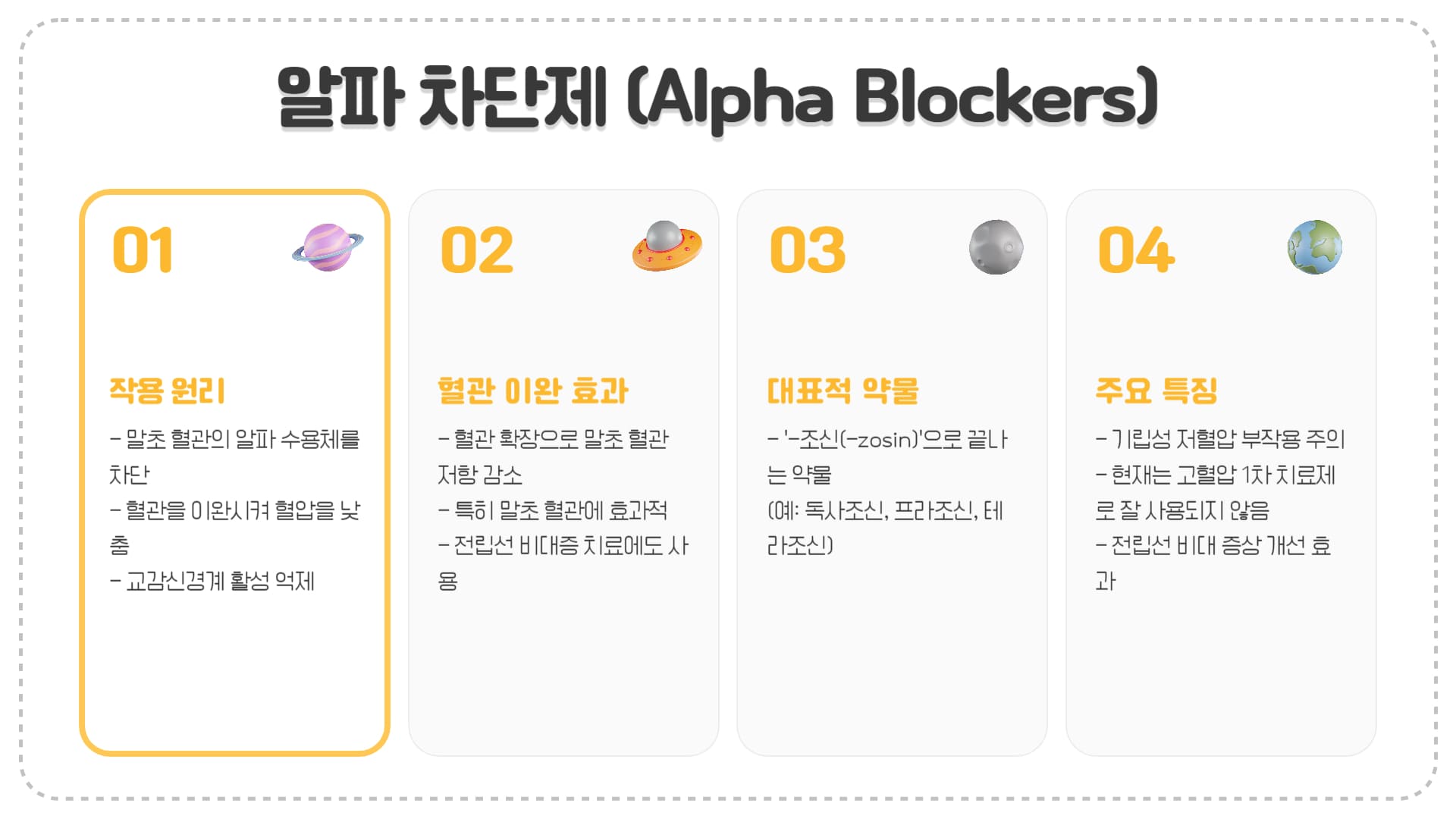 말초 혈관의 알파 수용체를 차단하여 혈관을 이완시키고 혈압을 낮춥니다. 전립선 비대증 치료에도 사용됩니다. | 주로 '-조신(-zosin)'으로 끝나는 약물 (예: 독사조신, 프라조신, 테라조신 등) |