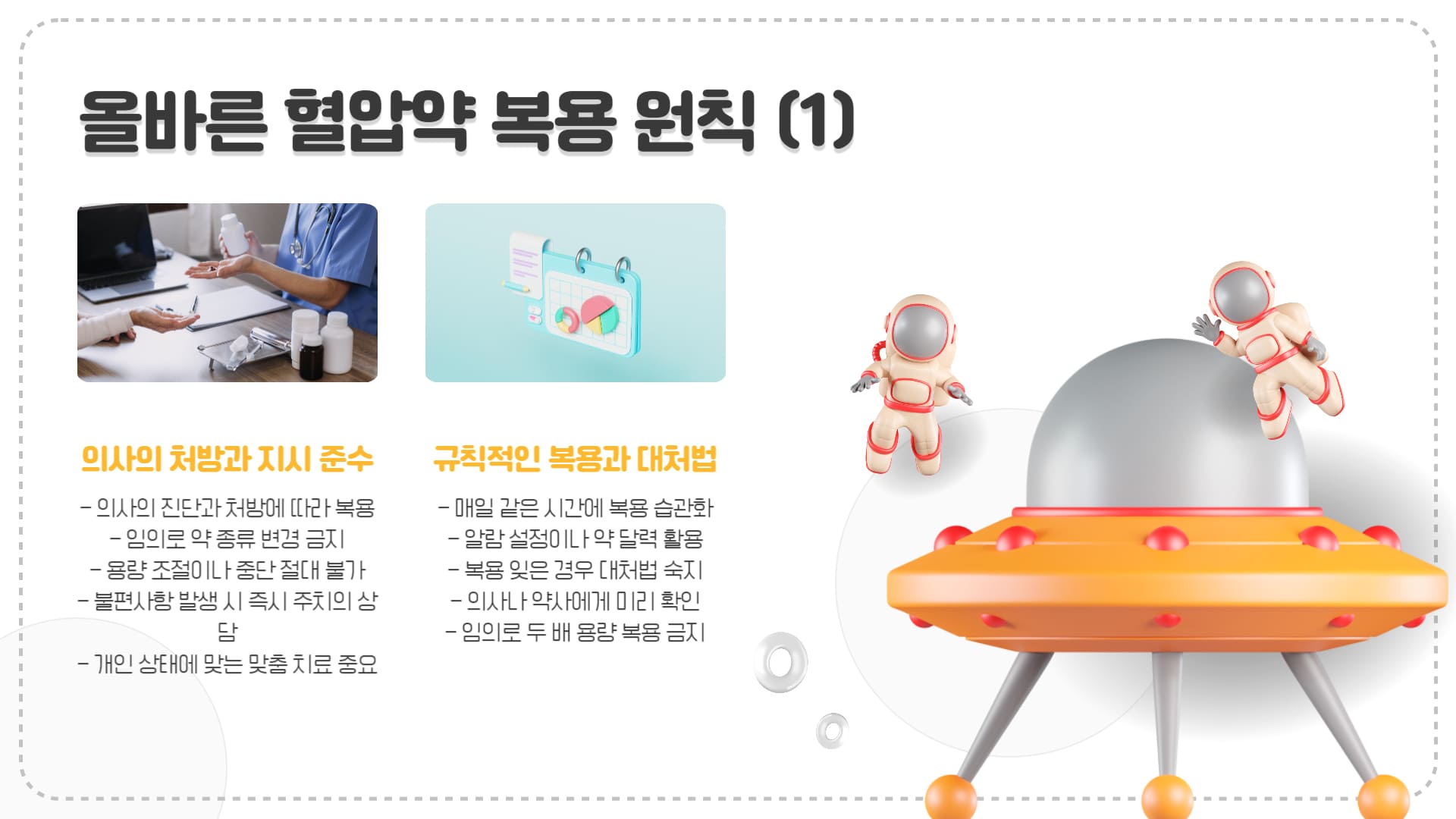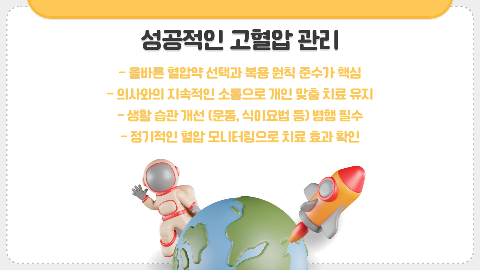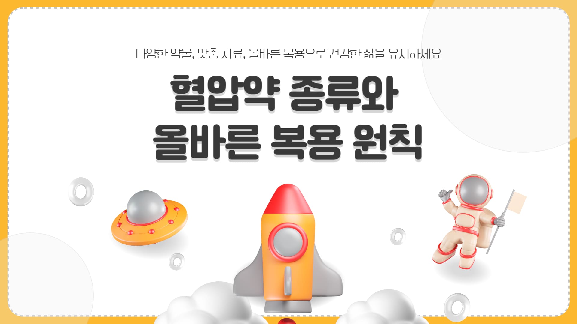 - 의사의 처방과 지시를 철저히 따르세요: 혈압약은 반드시 의사의 진단과 처방에 따라 복용해야 합니다. 임의로 약의 종류를 바꾸거나, 용량을 조절하거나, 복용을 중단해서는 절대 안 됩니다. 궁금한 점이나 불편한 점이 있다면 반드시 주치의와 상담하세요.