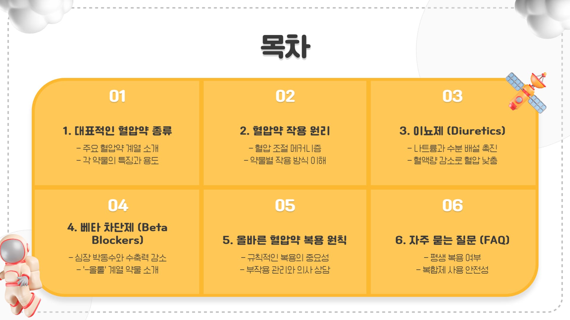 이 글에서 제공되는 혈압약 종류 및 관련 정보는 일반적인 의학 정보 이해를 돕기 위한 참고 자료일 뿐이며, 특정 약물을 추천하거나 의학적인 진단 및 처방을 대체할 수 없습니다. 혈압약의 선택, 용량, 복용 방법 등은 반드시 의사의 정확한 진단과 처방에 따라야 합니다. 임의로 약물을 변경하거나 중단하는 것은 매우 위험하며 심각한 건강 문제를 유발할 수 있습니다. 모든 약물 관련 결정은 반드시 주치의와 상의하시기 바랍니다.