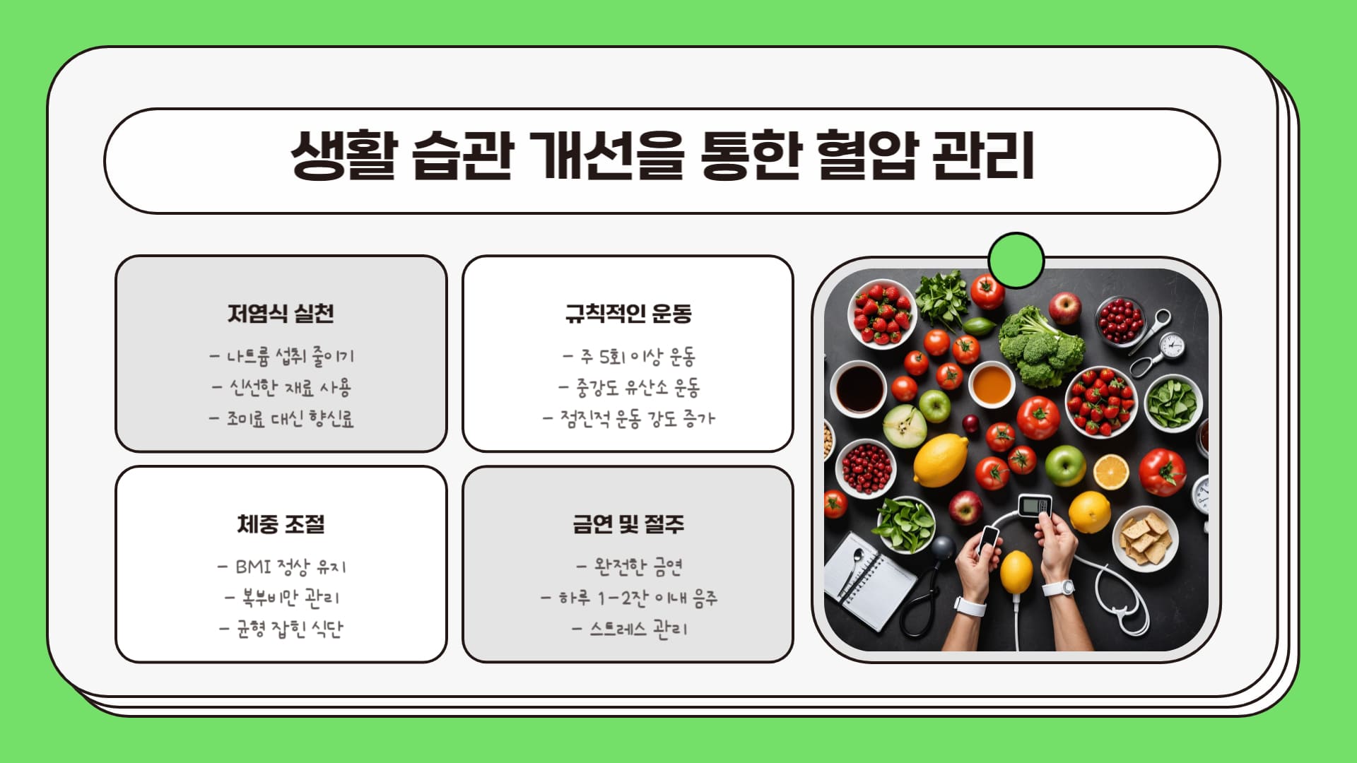 혈압 낮추는법 운동은 건강 관리의 첫걸음! 규칙적인 유산소 운동과 근력 운동을 병행하고, 나트륨 섭취를 줄이며 칼륨, 마그네슘, 칼슘, 섬유질이 풍부한 음식을 섭취하는 것이 중요합니다. 건