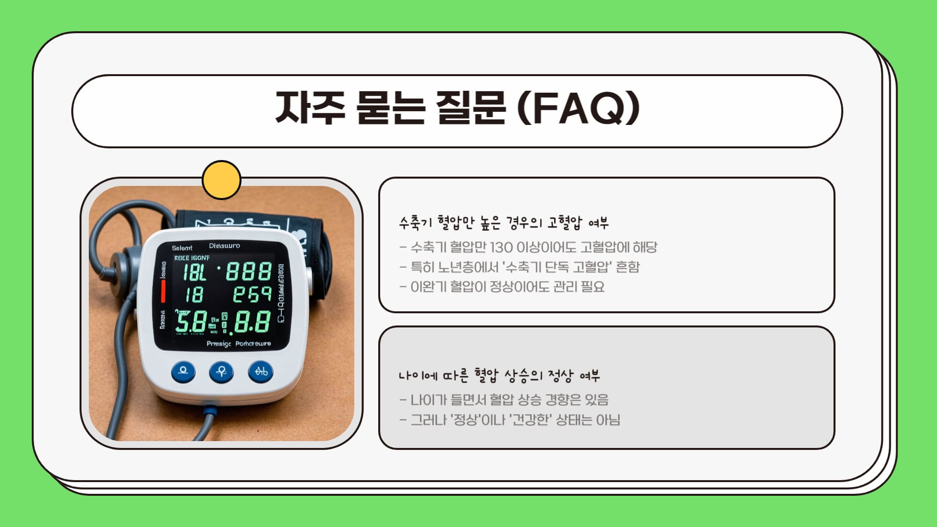 A4: 나이가 들면서 혈관의 탄력이 떨어지는 등 노화 현상으로 인해 혈압이 상승하는 경향이 있는 것은 사실입니다. 하지만 이것이 '정상'이거나 '건강한' 상태를 의미하는 것은 아닙니다. 연령과 관계없이 제시된 기준 이상으로 혈압이 높다면 합병증 위험이 증가하므로 적극적인 관리가 필요합니다.