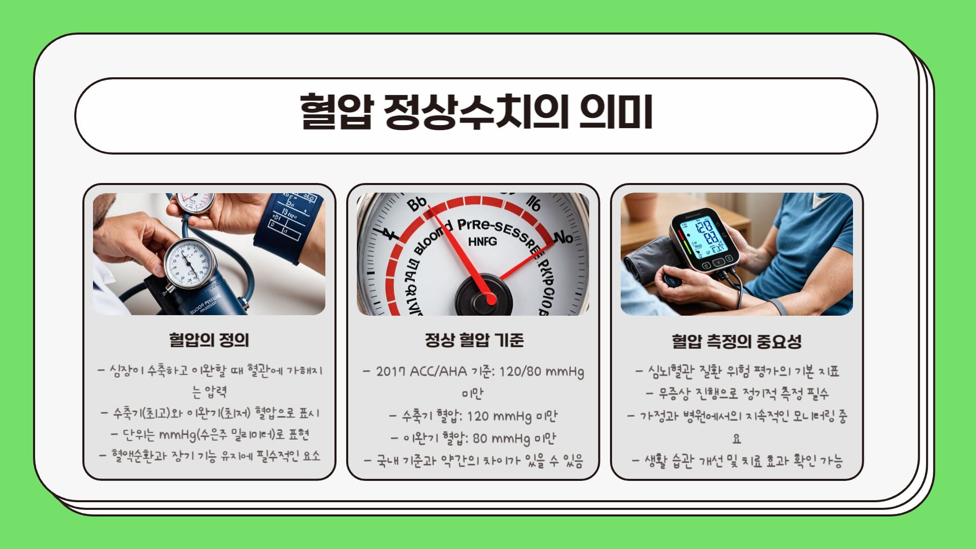 혈압 정상수치는 심뇌혈관 건강의 기본 지표입니다. 수축기 120mmHg 미만, 이완기 80mmHg 미만이 정상이며, 그 이상 단계별 기준과 의미를 알아봅니다.