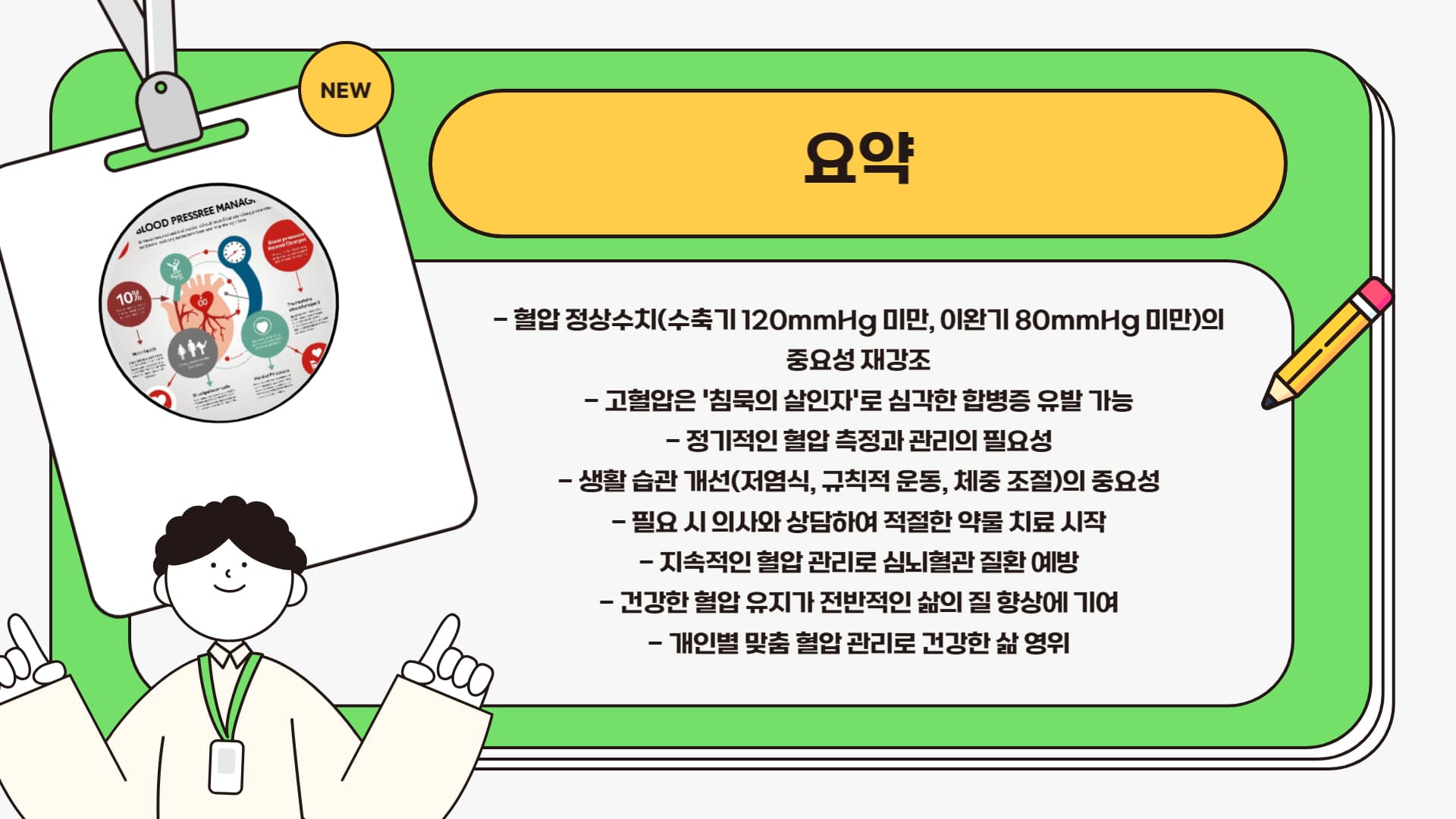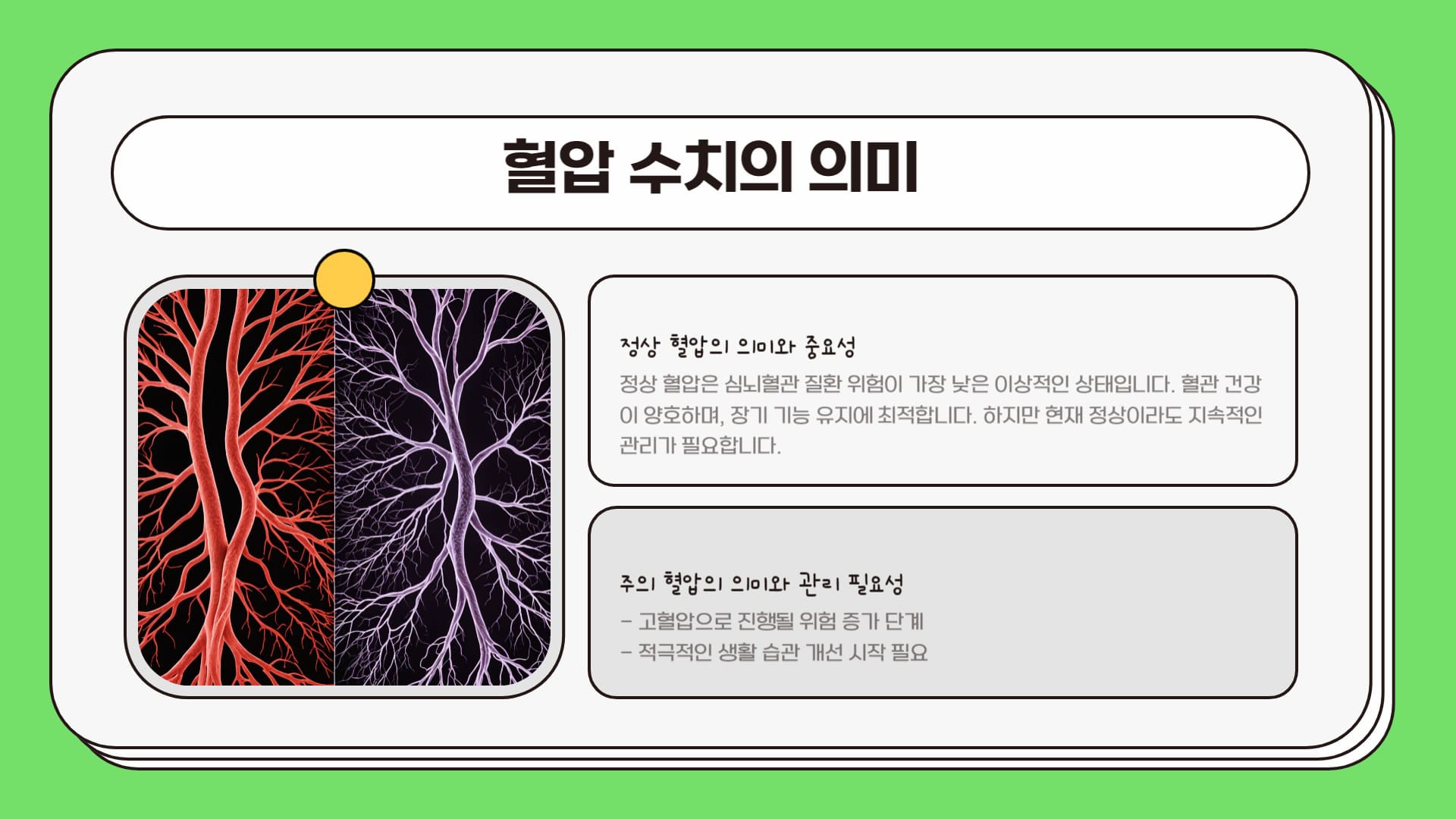 - 조기 관리의 효과: 특히 '주의 혈압' 단계에서부터 생활 습관을 개선하는 등 조기에 관리하면, 고혈압으로 진행되는 것을 막거나 늦출 수 있으며, 장기적으로 합병증 발생 위험을 현저히 줄일 수 있습니다.