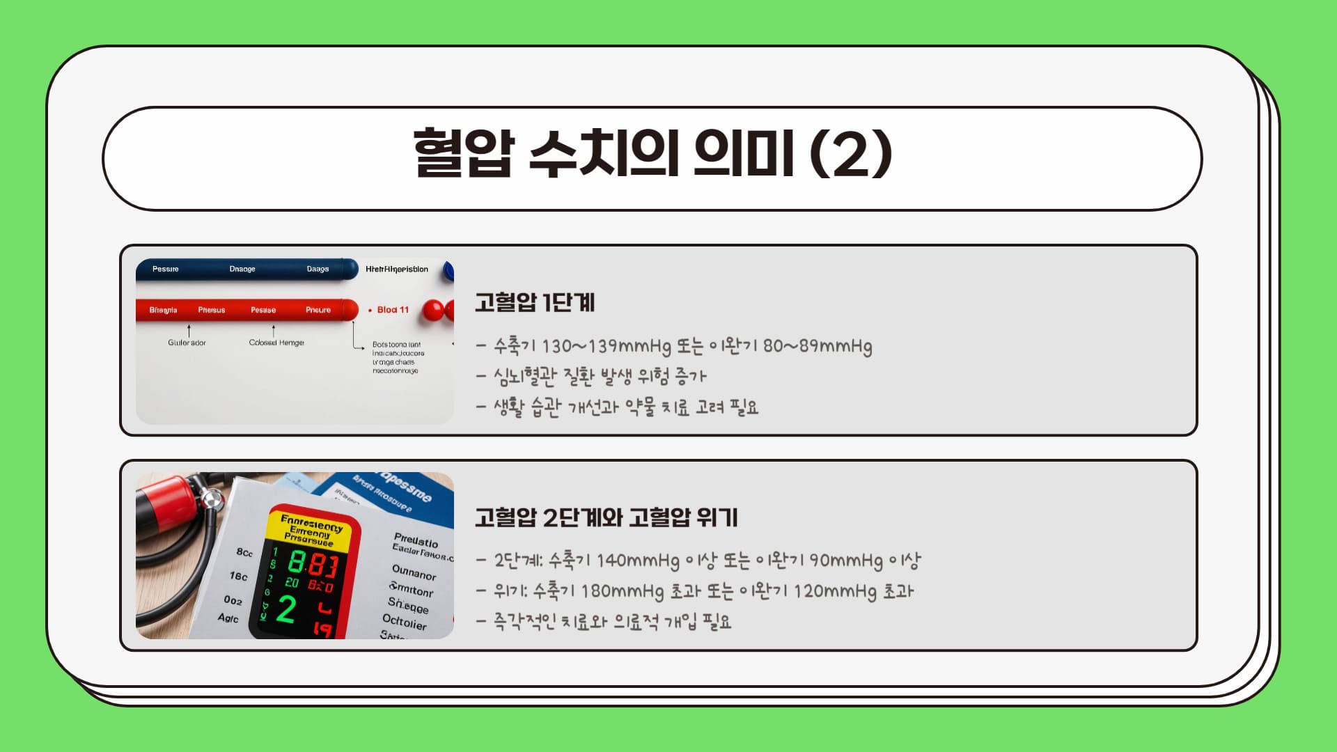 혈압은 수축기 혈압(최고 혈압)과 이완기 혈압(최저 혈압) 두 가지 숫자로 표시되며, 그 기준에 따라 정상, 주의 혈압, 고혈압 1단계, 고혈압 2단계 등으로 분류됩니다.