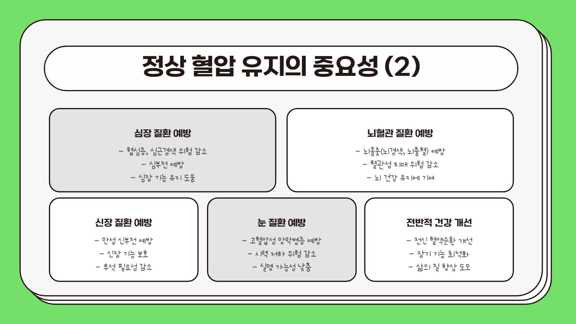 - 심각한 합병증 예방: 높은 혈압은 혈관 벽을 손상시키고 딱딱하게 만들어(동맥경화) 혈액 순환을 방해합니다. 이는 다음과 같은 치명적인 합병증의 주요 원인이 됩니다.