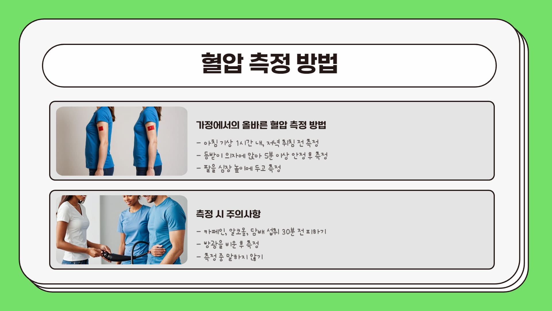 * 혈압은 측정 환경과 시간에 따라 변동성이 크므로, 한 번의 측정만으로 고혈압을 진단하지 않습니다. 안정된 상태에서 여러 번 측정하거나 24시간 활동 혈압 측정 등을 통해 의사가 종합적으로 진단합니다.